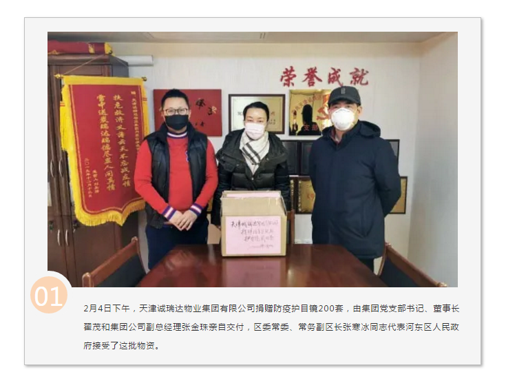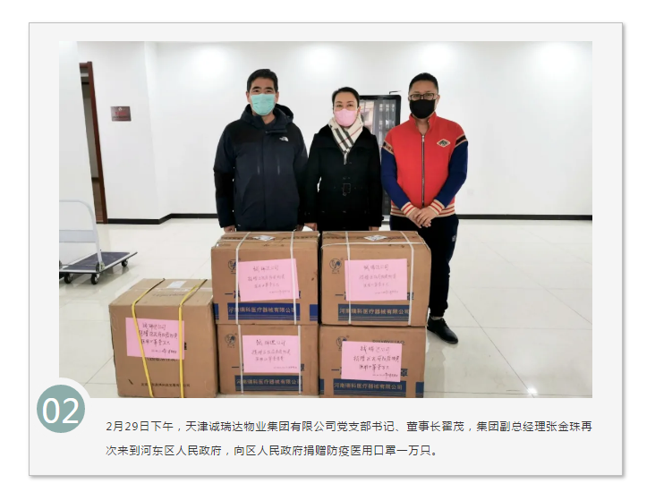 在全國人民抗擊新型冠狀病毒感染肺炎疫情的關鍵時刻,天津誠瑞達集團繼2月4日,向河東區人民政府捐贈護目鏡200套后,為助力天津市早日取得防疫阻擊戰的全面勝利,2月29日,再次向河東區人民政府捐贈醫用口罩一萬只,為河東區抗擊疫情貢獻星火之力。